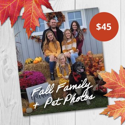 Get a beautiful family photo this fall... and you're welcome to bring your beloved pet(s)! We have arranged stunning fall decor on our property to provide the perfect backdrop for a family photo.